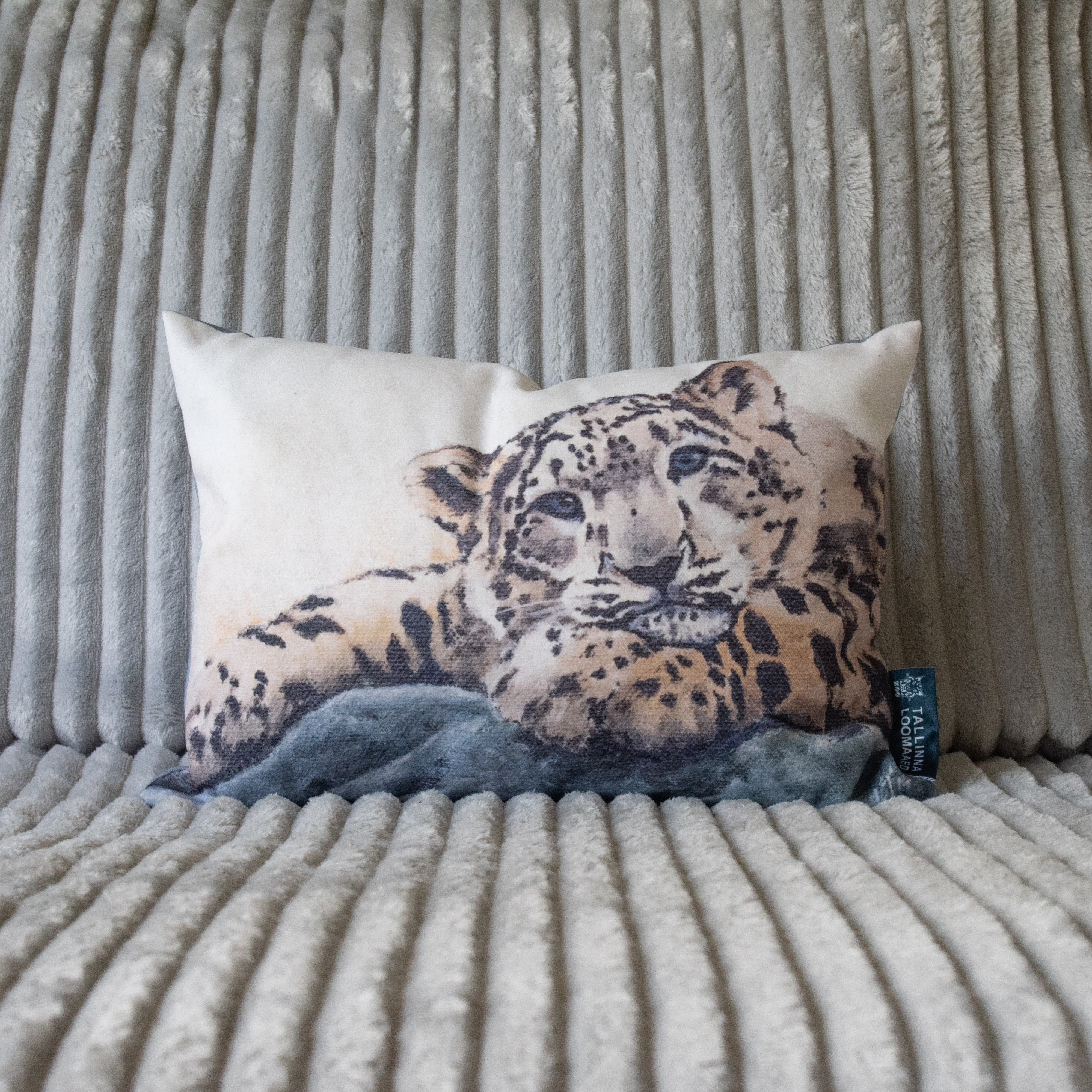 The design of the cushion features the painting “Mileedi on a Rock” by Leana Jalukse. All proceeds from the sales of the cushions are donated in the name of Tallinn Zoo and Foundation Lutreola to Snow Leopard Trust, the largest and oldest organisation working solely to protect the endangered snow leopard and its habitat.