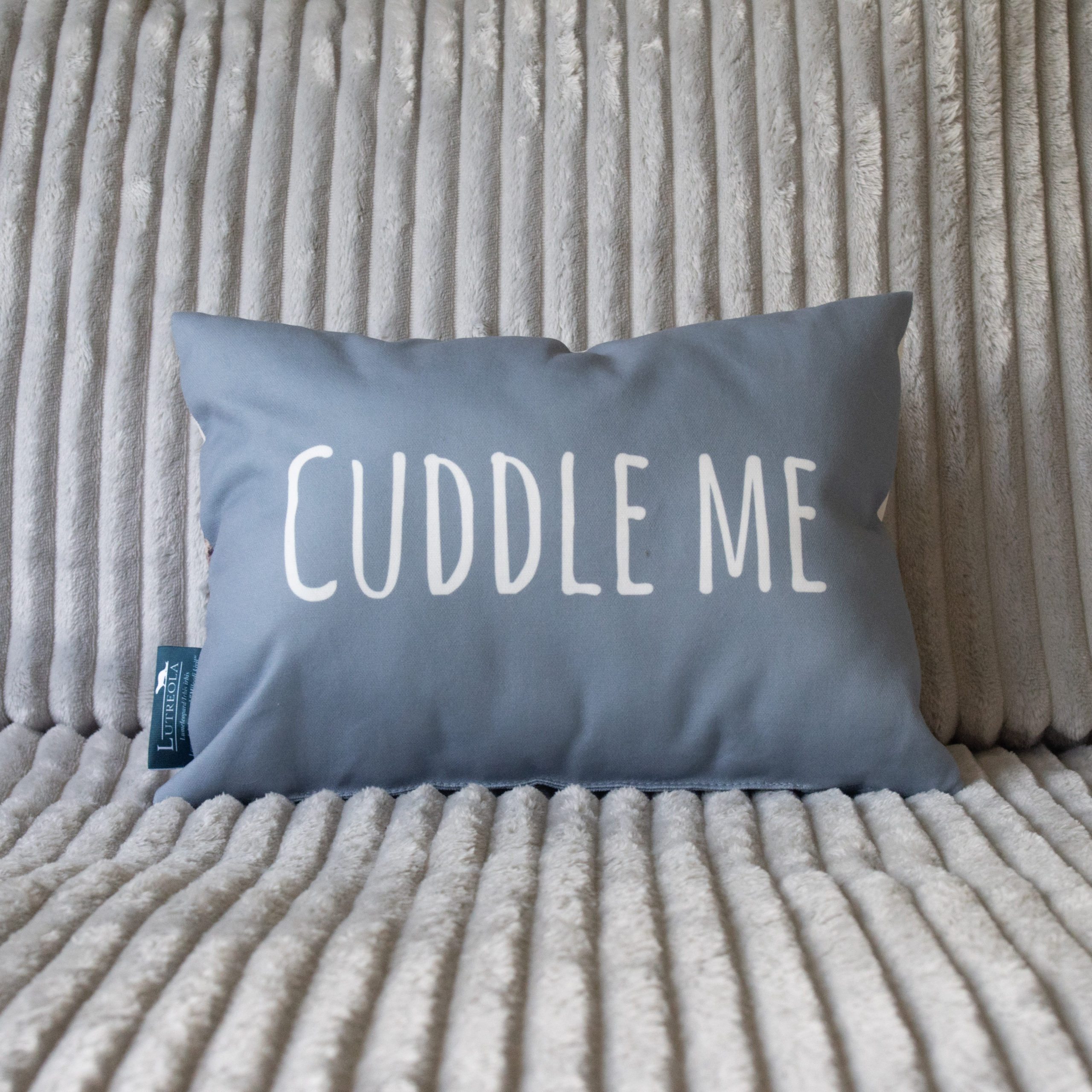 Padja tagaküljel on tekst “Võta mind kaissu” või “Cuddle me” – palun tee valik!